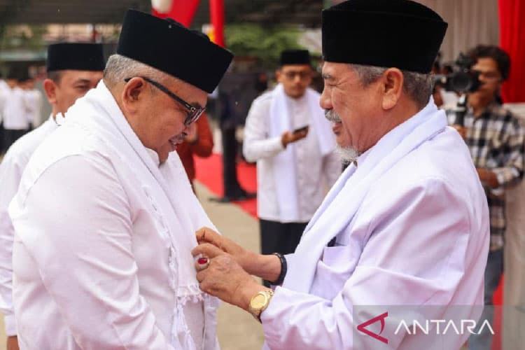 TIMES Bandung/Pimpinan pesantren Insafuddin Banda Aceh memberikan kain kepada Sekda Aceh Bustami Hamzah usai peringati Hari Santri, di Banda Aceh, Selasa (24/10/2023). (FOTO: ANTARA/HO/Humas Pemprov Aceh)