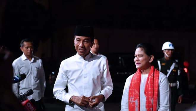 TIMES Bandung/Capres nomor urut 01 Joko Widodo bersama istri Iriana Joko Widodo tiba di lokasi untuk mengikuti debat Pilpres 2019 putaran kelima, di Hotel Sultan, Jakarta, Sabtu (13/4/2019). (FOTO: Rivan Awal Lingga/Antarafoto)