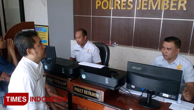 TIMES Bandung/Wakil Ketua Bidang Litbang dan IT DPD Partai Perindo Kebupaten Jember, Ahmad One Prastiono saat melaporkan Ketua DPD Partai Perindo Kabupaten Jember Hanung Prijobodo ke Polres Jember, Senin (6/5/2019). (FOTO: Dody Bayu/TIMES Indonesia)