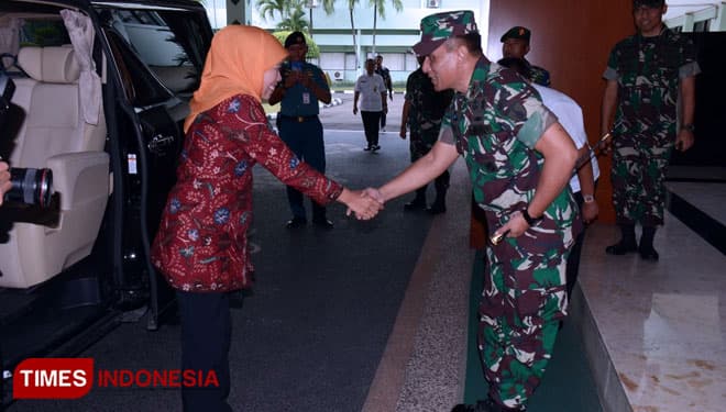 TIMES Bandung/Pangdam V/Brawijaya, Mayjen TNI Wisnoe, P.B, menyambut kedatangan Gubernur Jatim, Khofifah Indar Parawansa di Makodam V/Brawijaya, Rabu (20/2/2019).(Foto: Istimewa)